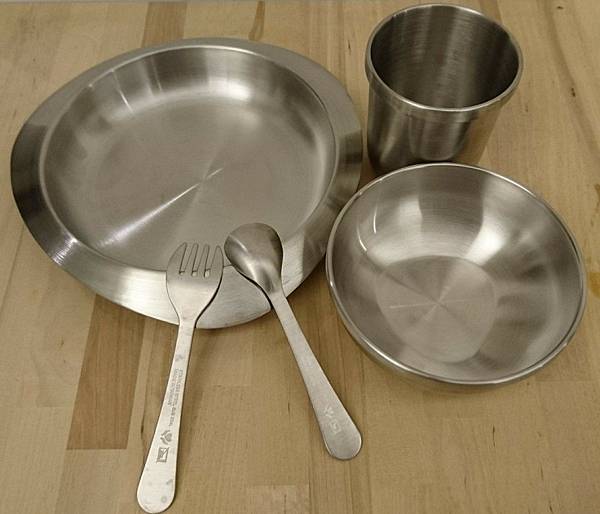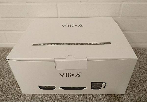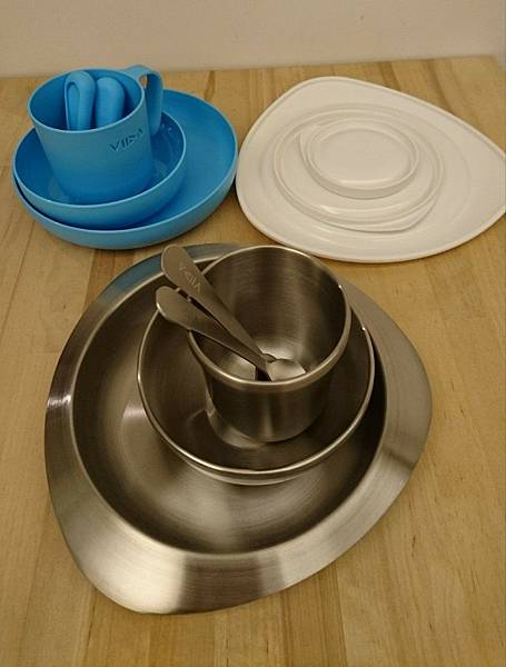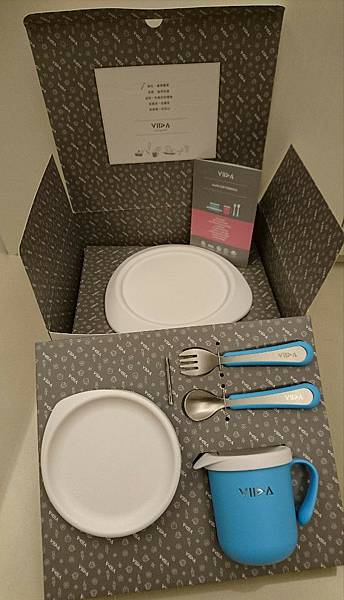 內裝分為兩層,VIIDA抗菌不鏽鋼餐具組含有餐碗、餐盤、杯子及叉子湯匙組。很適合送禮,如果寶寶週歲生日不知道要送什麼,非常推薦這個禮盒,實用又美觀。