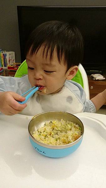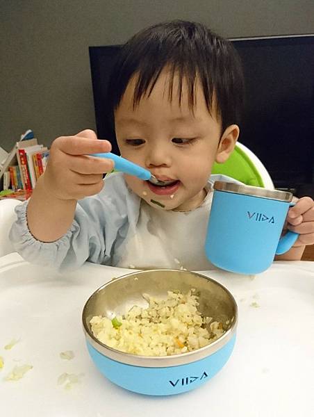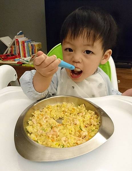 扇型設計的湯匙,舀取食物容易。小飛可以精準的放入口中,剛好一口份量吃光光。